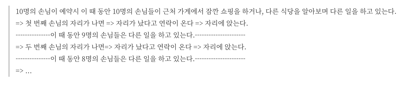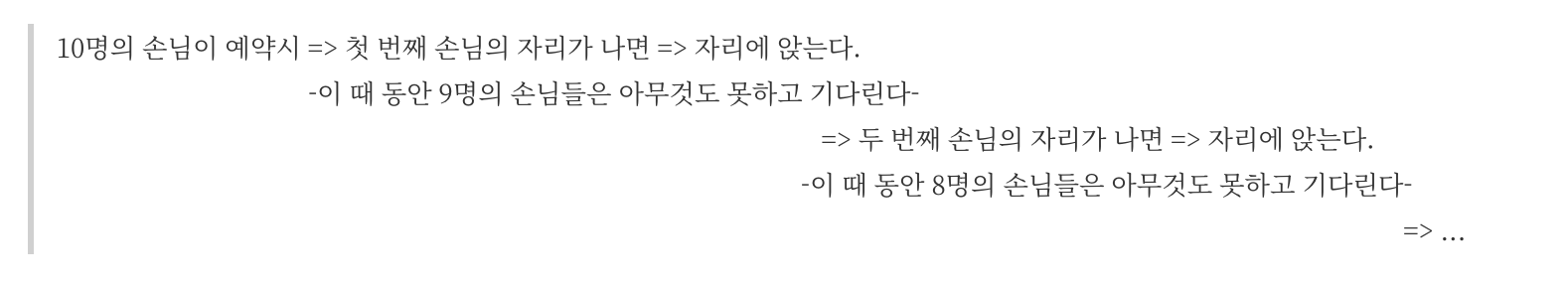 이렇게 손님들은 자리가 날 때까지 식당에서 기다리기만 해야하는게 아니라 다른 일을 하고있다가 원하는게 준비된 시점(여기선 자리가 난다 에 해당) 에 원하는 동작(여기선 자리에 앉는다.에 해당)을 할 수 있다.