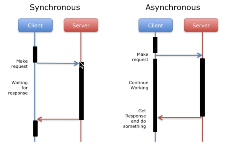 즉, 비동기는 node.js의 핵심 부분으로 아래 그림의 Asynchronous(비동기) 방식처럼 작동한다.