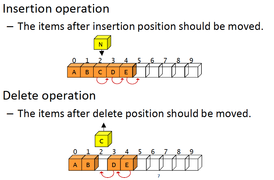 장점은 i번째 원소를 바로 알 수 있다는 것이지만 단점은 원소의 추가, 삭제가 까다롭다.