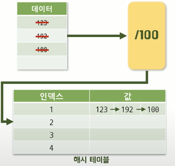해당 Hashed Value에 이미 값이 있으면 그 뒤에 chain으로 연결시키는 것이다.