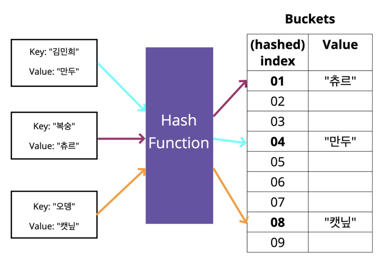 아래 그림에서 맨 왼쪽에 이런 데이터가 있고, 이를 Hash 자료구조를 이용해서 정리를 하고싶다고 합시다.