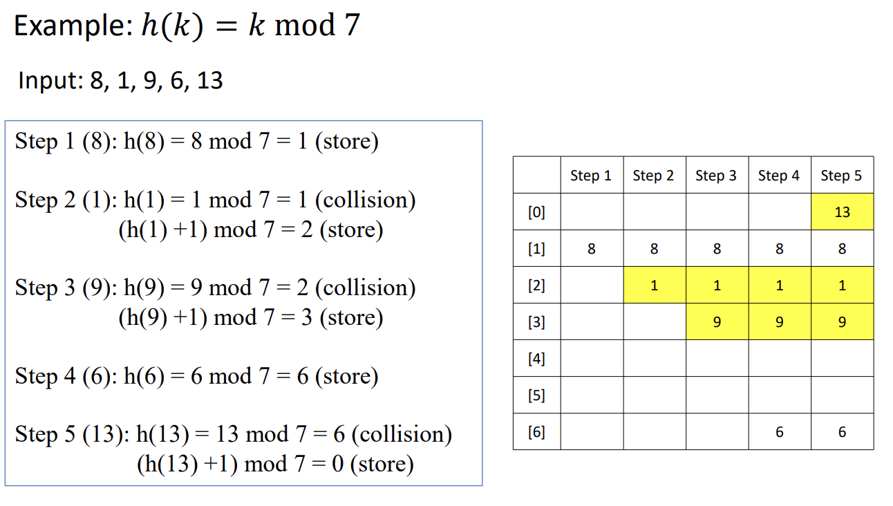 그래서 충돌이 발생하면 그 다음 (비어있는) Hashed value로 넣어버린다.
