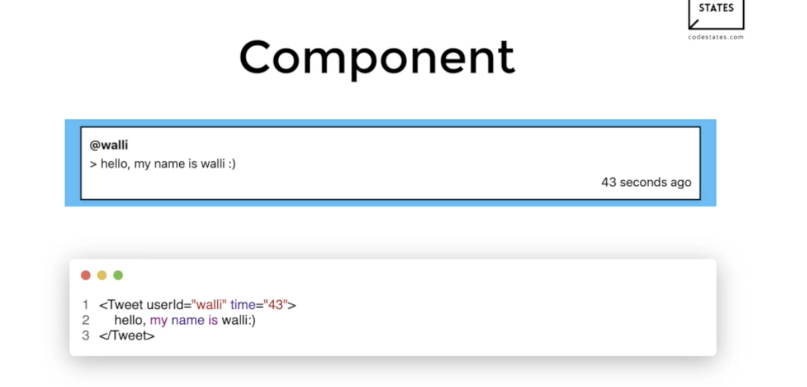 이처럼 원래 <Tweet></Tweet>라는 태그는 없지만, 이런 하나의 의미를 가진 태그인 component를 만들어서 사용할 수 있다.