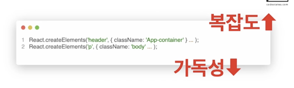 JSX를 사용하지 않으면 React.createElements()를 써서 이렇게 코딩해야 하고, 그러면 가독성도 떨어지고, 복잡도는 높아진다.