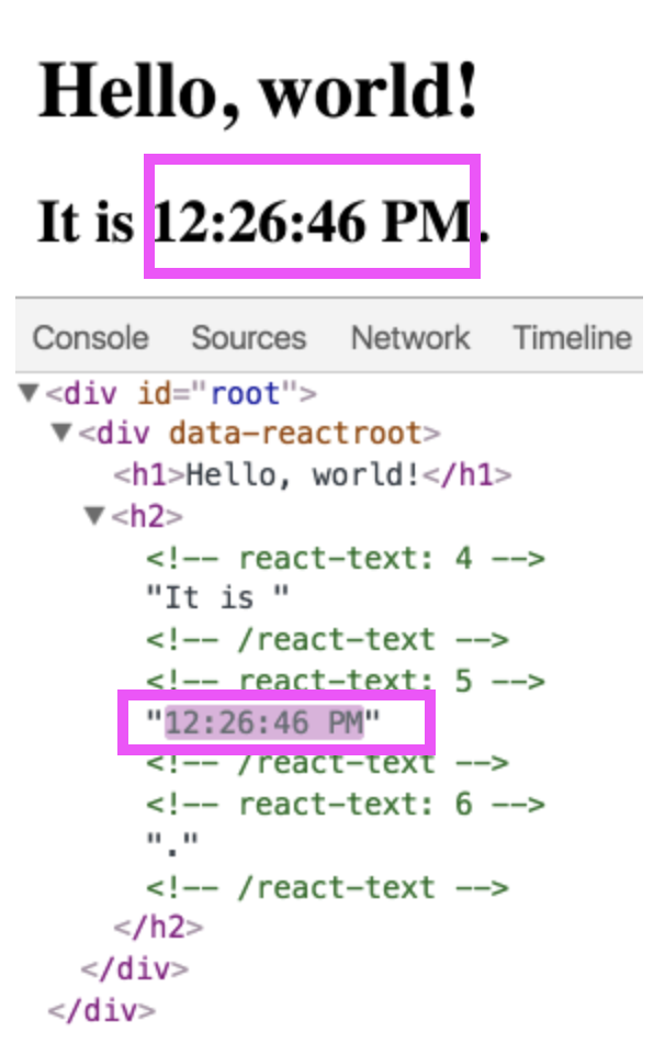 에서는 매 초마다 <h2><h2>It is {new Date().toLocaleTimeString()}.</h2>이 부분이 다른 새로운 Element가 전달될텐데, 아래에서 표시된 부분만 업데이트 해준다.