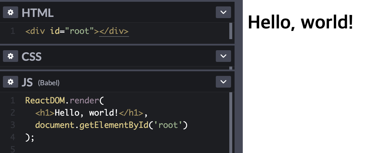 이렇게도 쓸 수 있을 것이다. JSX가 사용되는 방식으로, JSX로 생성한 element를 render함수로 root이라는 id를 가진 DOMelement에 rendering 해주고 있고, 그 결과 Hello, World!가 화면에 출력된다.