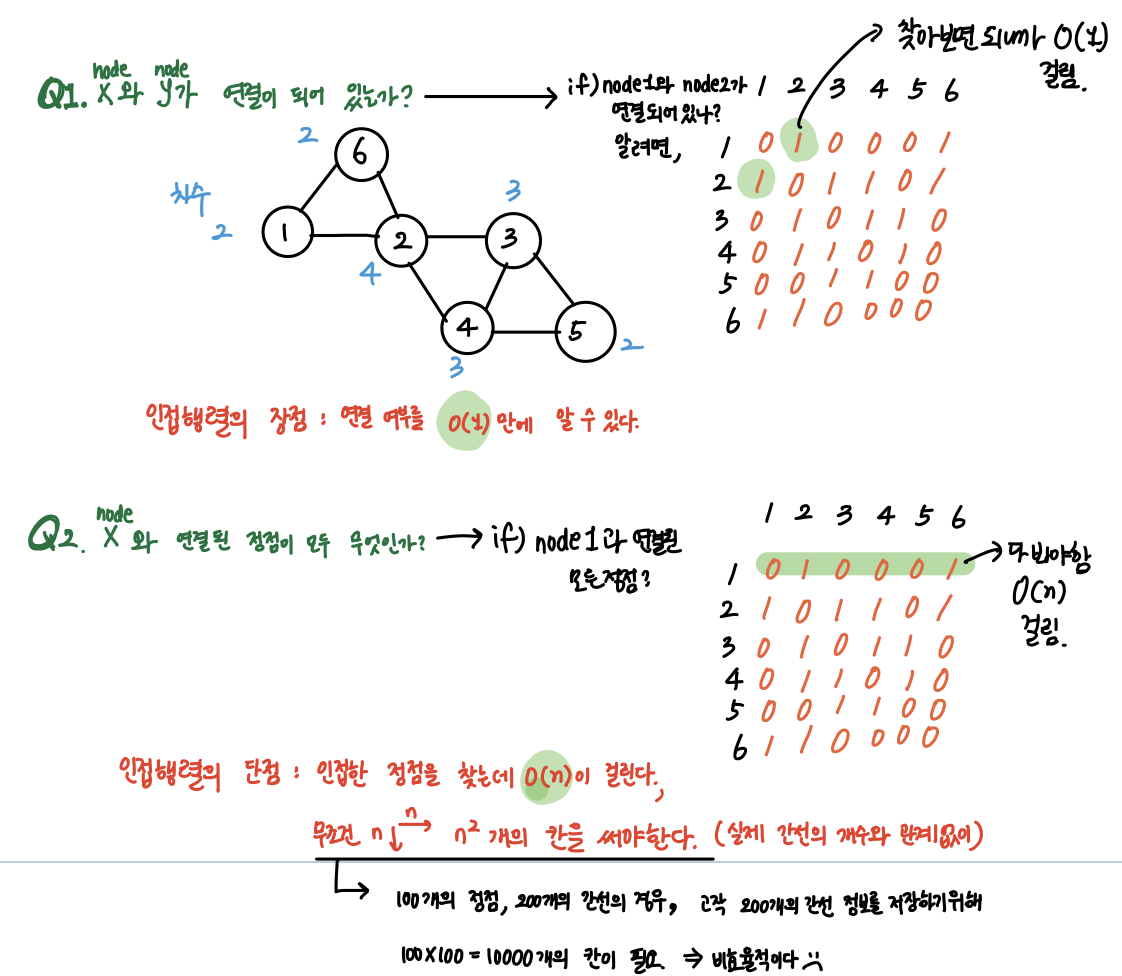 - 인접 행렬의 장점: 연결 여부를 O(1)만에 알 수 있다.