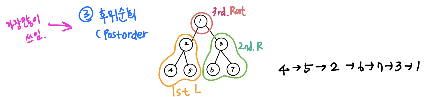 후위 순회(Postorder Traversal): 좌 → 우 → 부모