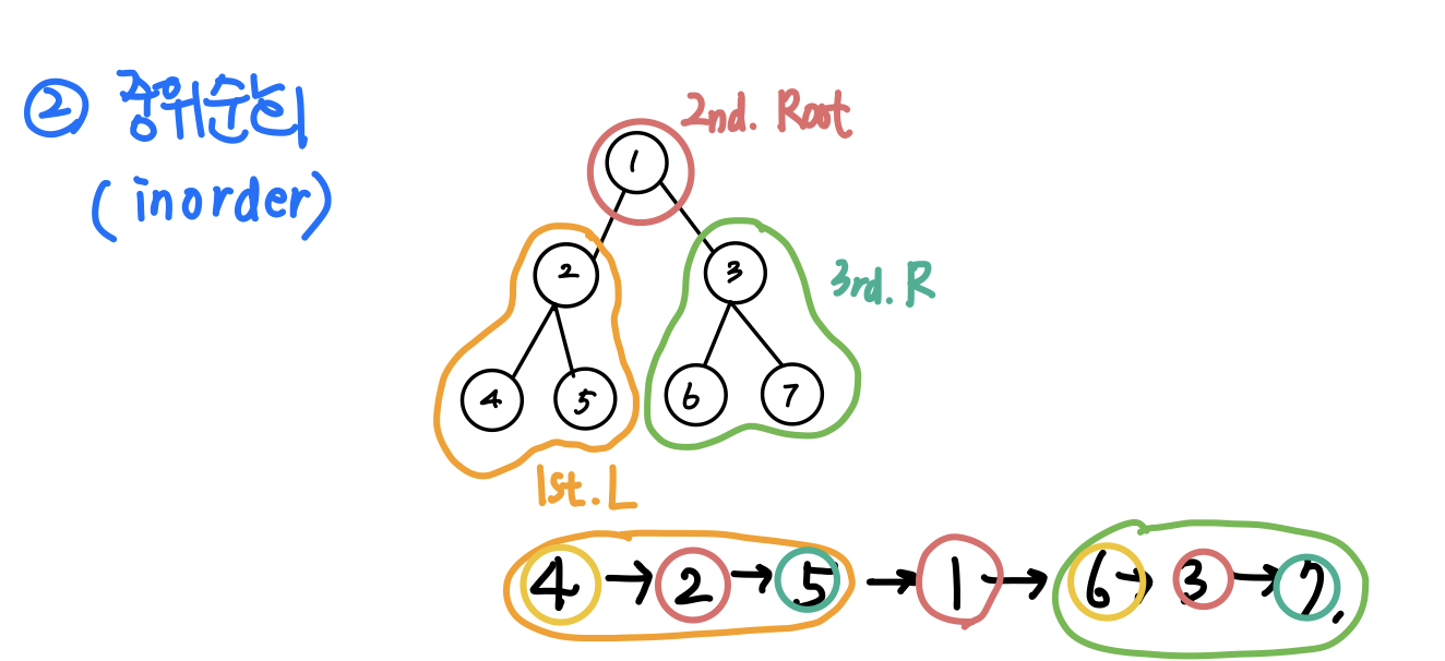 중위 순회(Inorder Traversal): 좌 → 부모 → 우