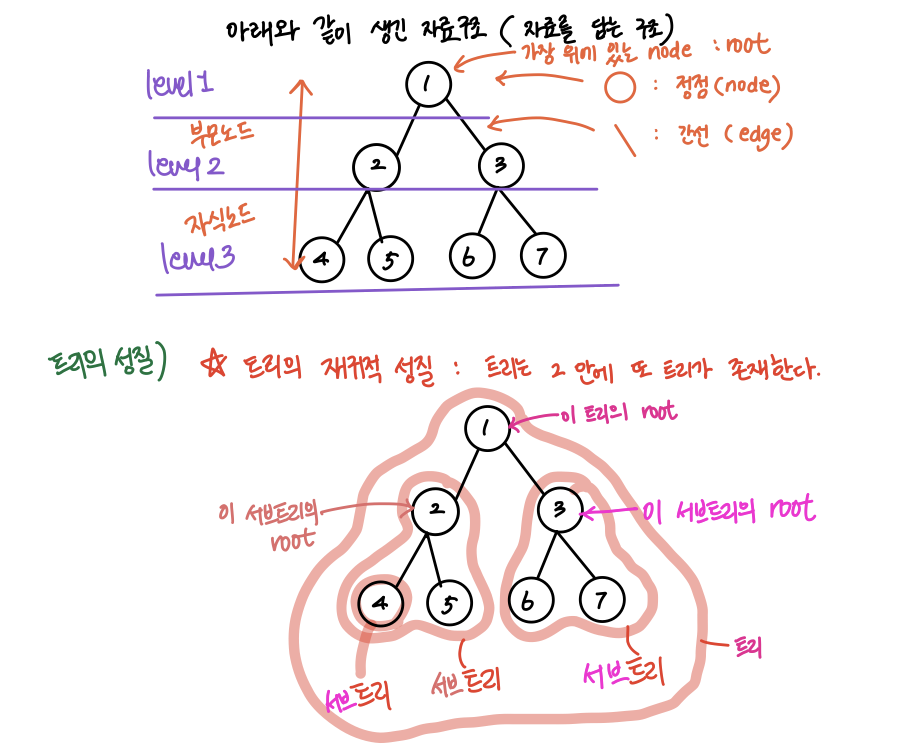 : 노드로 구성된 계층적 자료구조 / 사이클이 없는 그래프