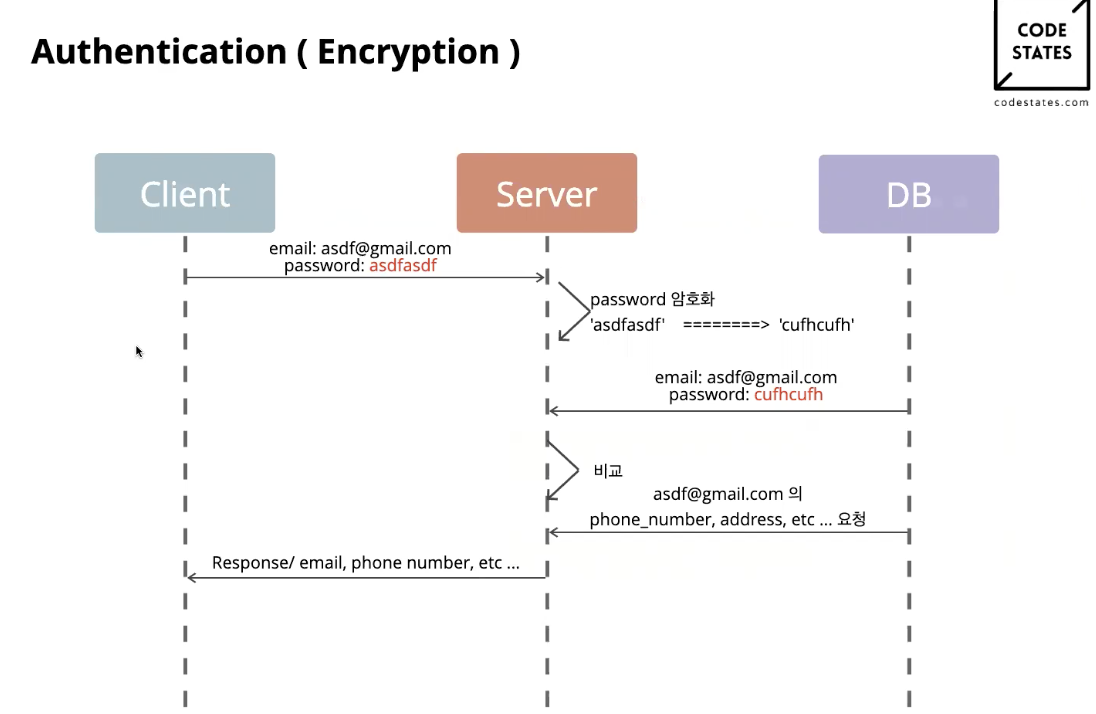 클라이언트가 서버에게 email과 password를 주면서 요청하면 => 서버는 일를 암호화시켜서 => 암호화시킨 결과와 DB에 암호화되어서 저장되어있던 문자열을 비교하는 과정을 거친다. => 그러면 이메일을 가지고 관련된 개인 정보를 요청해서 => 이 정보를 반환해주게 된다.