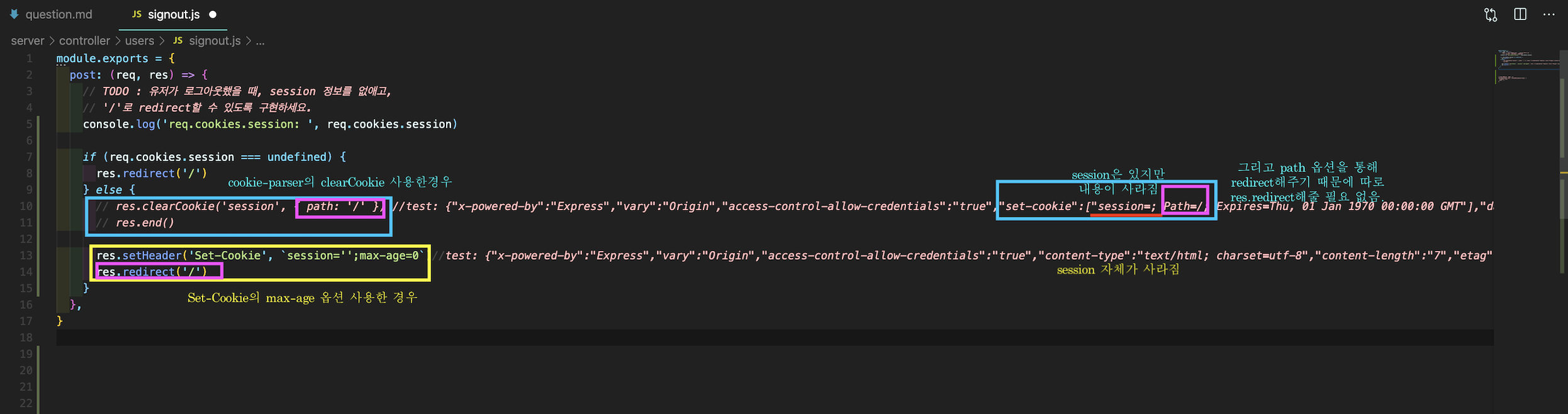 ※ POST /user/signout 기능 구현: Set-Cookie의 max-age=0 사용 결과와 res.clearCookie 사용 결과 비교