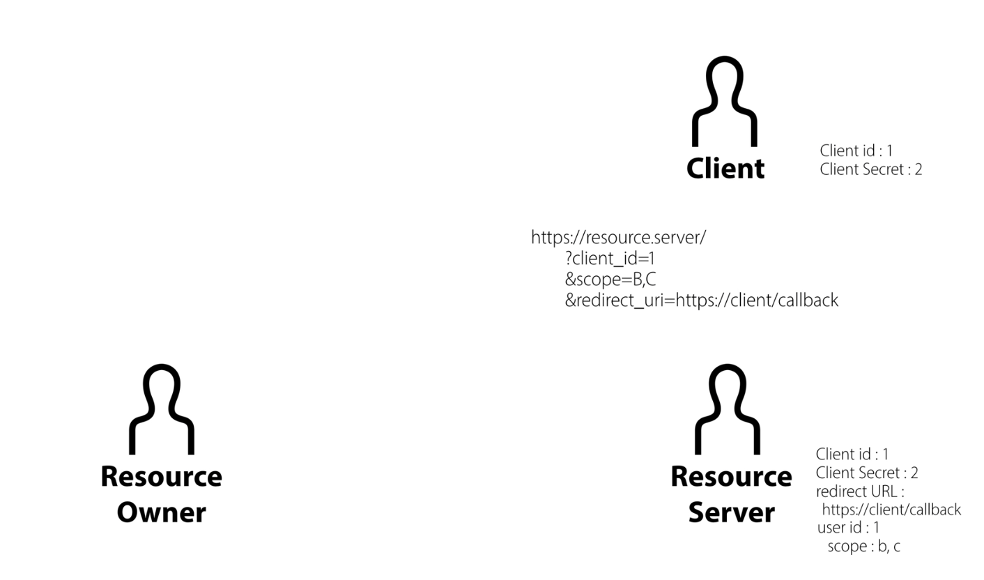 ClientResource Server 를 사용하는 주체. 내가 구현하게 될 어플리케이션Resource OwnerResource Server 에 인증되어 있는 사용자. 내가 구현한 어플리케이션을 사용 할 사용자Resource Server데이터를 가지고 있��