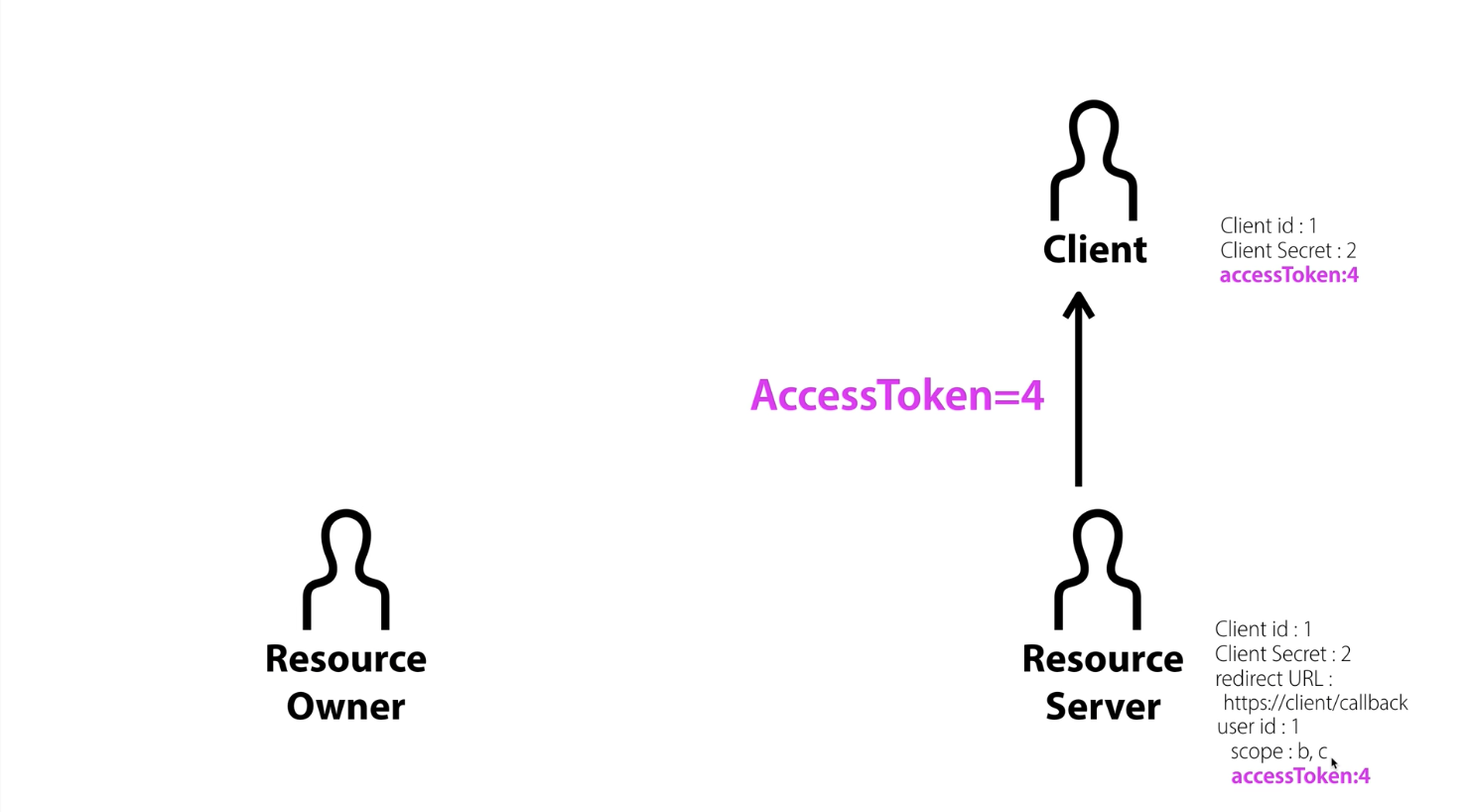 1. Resource Server와 Client는 승인이 다 되었으므로 앞으로 중복 인증을 피하기 위해Authorization code를 지운다. 그리고 Resource Server는 Access Token을 발급했다!