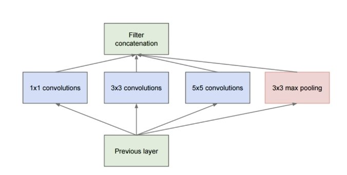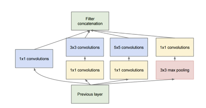 input이 들어왔을때, 일반적인 convolution layer는 1x1, 3x3등의 한가지 filter만 통과해서 다음으로 넘어가게 됩니다. 그러나 Inception module의 경우는 옆의 그림과 같이 한 번에 다양한 크기의 convolution filter을 통과한 후, 3x3 max pooling 도 진행한다. 그리고 filter concatenation을 해서 feature map들을 모아서 출력을 하는 것입니다.
