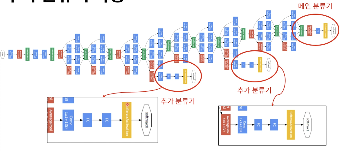 이것의 장점은, 메인분류기가 있는 맨 끝에서부터 역전파 Gradient Descent를 해주게 되면 기울기 소실이 발생하여 학습이 잘 되지 않는 문제가 있는데,