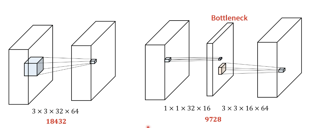 이러한 Bottleneck 구조의 활용으로, Receptive field를 유지하면서 파라미터 수를 줄였고, 파라미터 수를 줄인다는 것은 곧 연산량을 줄인다는 것입니다.