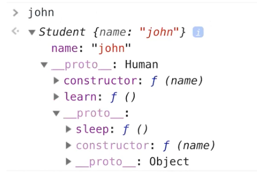 이렇게 잘 상속되어 Human이 부모 object, Student는 자식 object으로 구현된 Student instance인 john이 만들어짐을 알 수 있습니다.