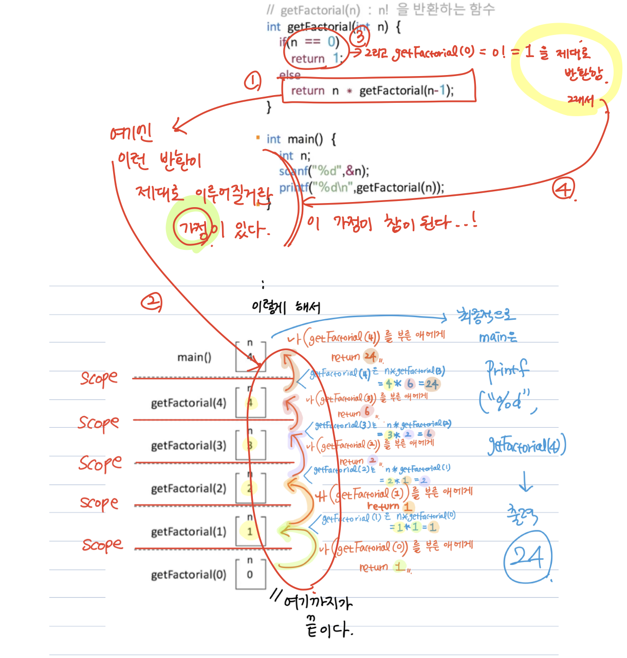 예시로 보면, n! = n x (n-1)! 이라는 수많은 가정을 하면서 계속 재귀 속으로 들어가다가