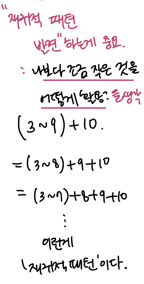 왜 귀납적 계산법이 제대로 된 값을 반환하는가?'=> 왜냐하면 수많은 가정을 하다가 맨 끝에는 정확한 값이 있기 때문이다.