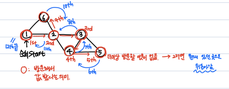 나를 먼저 방문하고, 그 다음으로(이렇게 선행관계가 있다.) 나와 인접한 노드를 차례로 방문한다. 단, 방문했던 노드는 다시 가지 않는다.