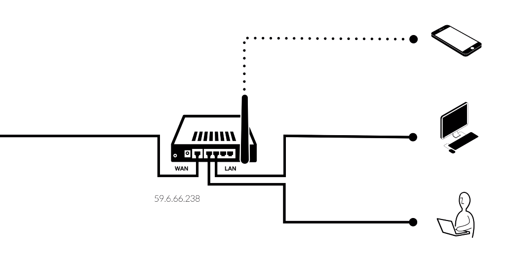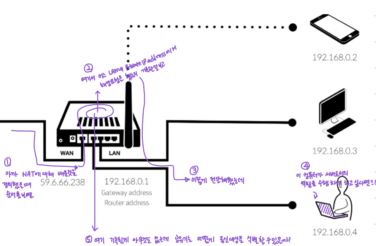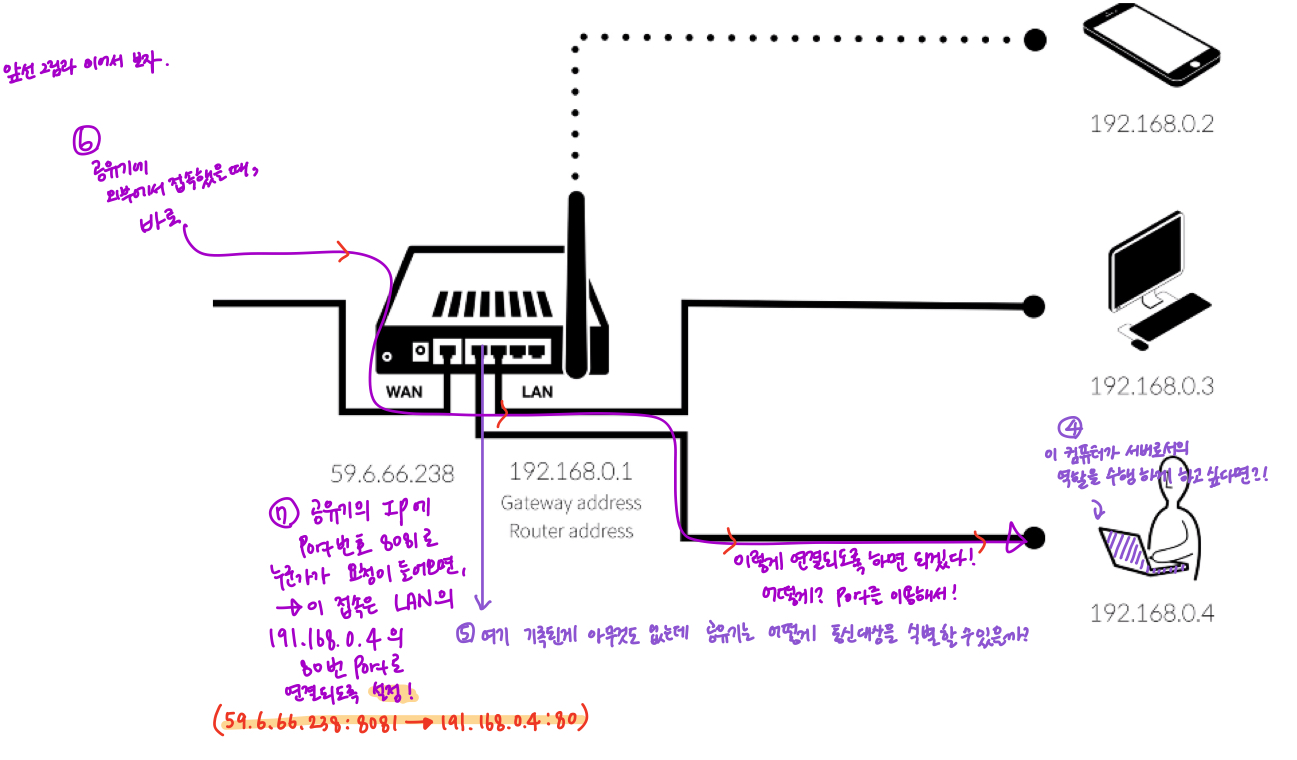 전세계 어디서나 WAN을 통해 내 공유기로 접속할 수 있게 하는 IP(그림에서 59.6.66.238에 해당)는 public IP address 라고 하며