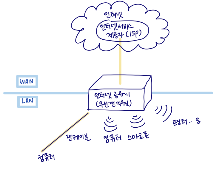 그리고 저 공유기는 광역 네트워크(인터넷; WAN; Wide Area Network)에 소속되어 있다.