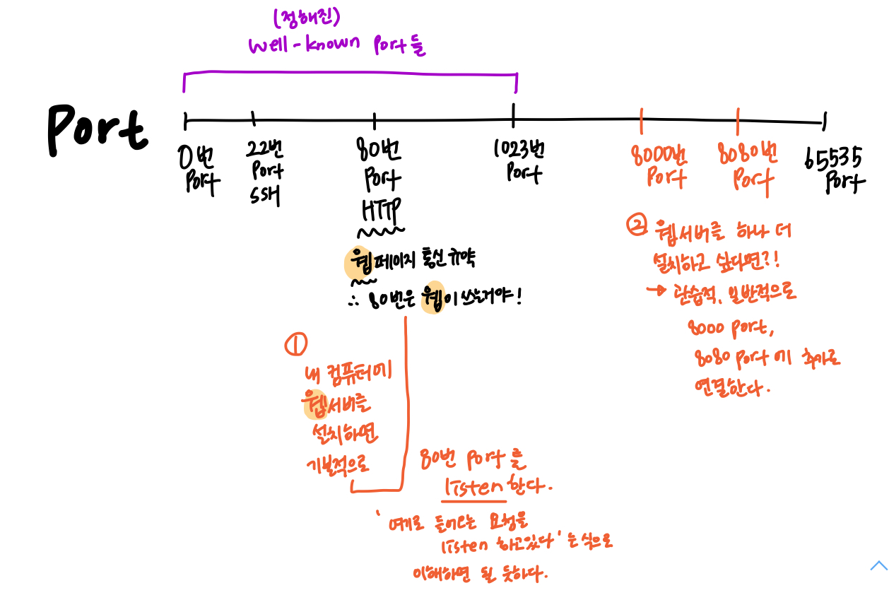 하나의 컴퓨터에는 여러개의 서버가 설치 될 수 있다. 개발공부를 하면서, 프로젝트를 진행하면서 비록 localhost환경이긴 하지만 여러개의 서버 코드를 동시에 실행시켜놓은 적이 있다. 이때 각 서버를 어떻게 식별해주었는지 기억해보면~ 바로 port번호였다.