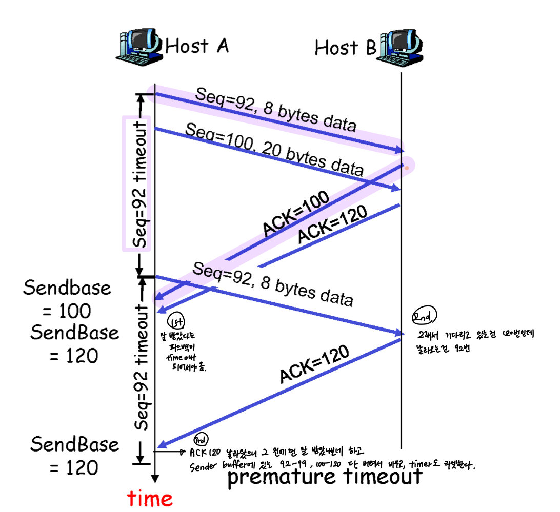 - TCP uses single retransmission timer. 이건 Go Back N 방식과 유사하다.