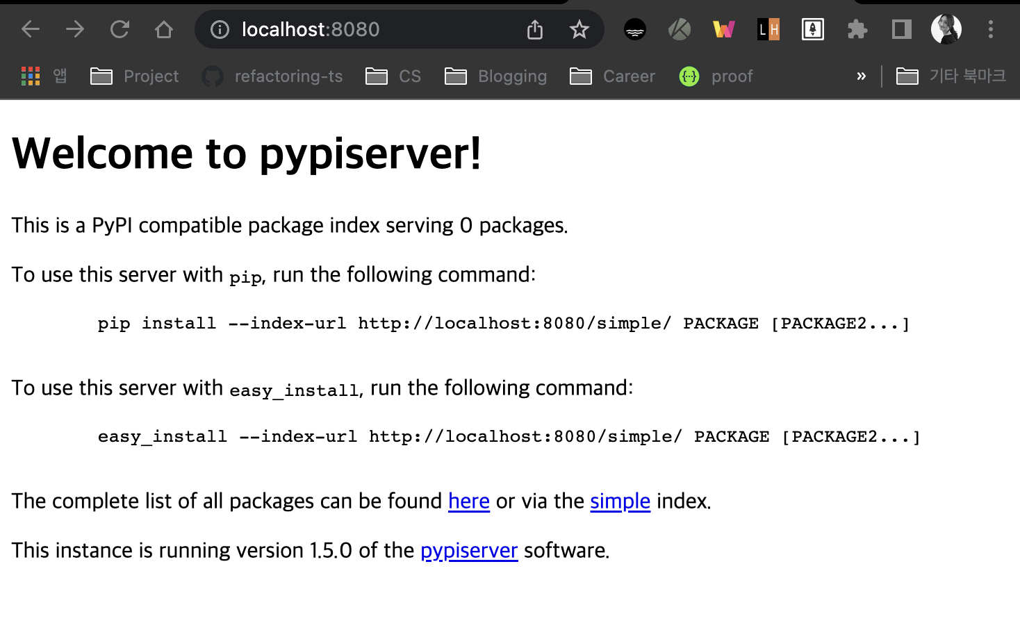 PYPI는 Python Packagy Index로, 우리가 pip install로 설치하여 사용할 수 있는 파이썬 관련 패키지 저장소이다. 사내 프로젝트들이거나 private하게 설치되어야 하는 사내에서 개발된 패키지들은 private Pypi server를 구축하고 여기에 업로드해서 사용하는 것이 필요하다.
