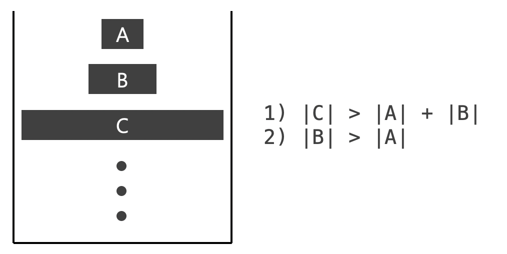 Tim sort에서는 하나의 run이 만들어질 때마다 스택에 담는데, run을 스택에 push할 때마다 스택의 맨 위의 세 run (위의 그림에서 A, B, C) 이 위의 그림과 같이 두 조건을 만족해야 한다.