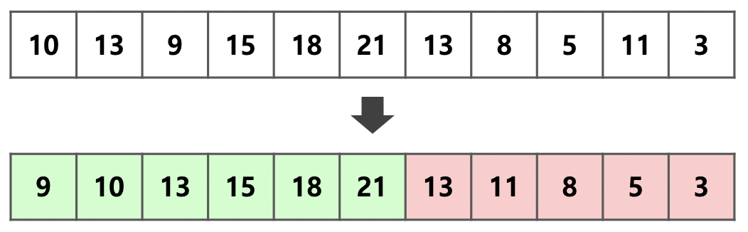 여기서 멈추지 않고 최대한 덩어리 x를 크게 만들어야 하므로 뒤의 원소 또한 감소한다면 이 덩어리에 포함시킨다. 이 배열에서 [3]의 경우 이어지는 감소하는 원소들이 될 수 있으므로 같은 덩어리로 묶는다.