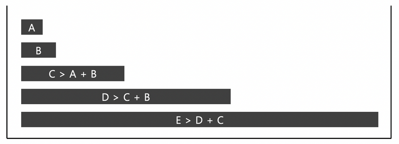 Tim sort에서는 하나의 run이 만들어질 때마다 스택에 담는데, run을 스택에 push할 때마다 스택의 맨 위의 세 run (위의 그림에서 A, B, C) 이 위의 그림과 같이 두 조건을 만족해야 한다.