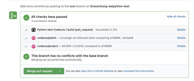 그리고 coverage report tool인 codecov 봇을 사용하도록 설정하여서 coverage 결과를 comment 형식으로 보여질 수 있도록 할 수 있습니다.