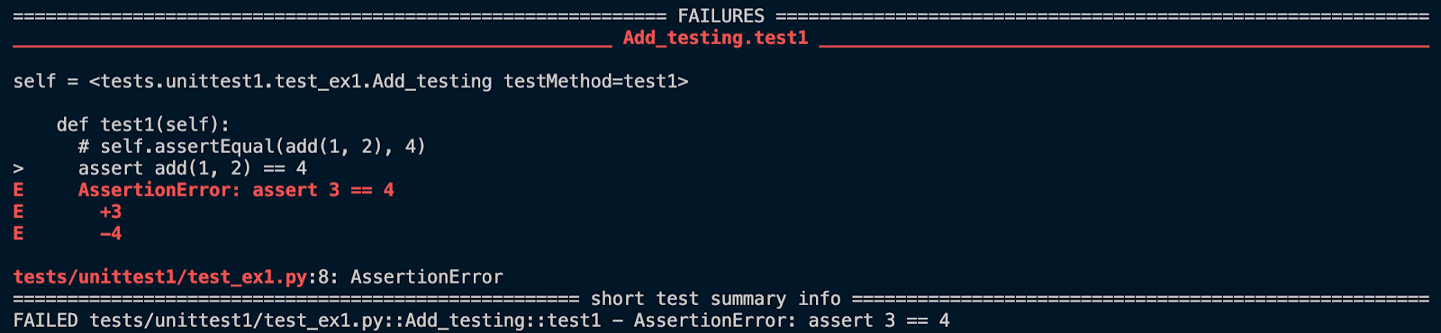 class Add_tesing(unittest.TestCase): def test1(self): assert add(1, 2) == 4