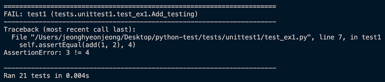 Unittest로 짤 경우, 테스트용 메소드로 잘 못 작성하였을 때는 AssertionError: 3!=4 처럼 어디가 일치하지 않는지 나타내주면서 테스트에러로서 결과를 출력해줍니다.class Add_testing(unittest.TestCase): def test1(self): self.assertEqual(add(1, 2), 4)