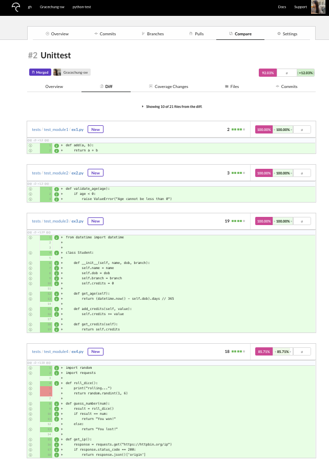 Github actions에서 main 브랜치에 push 나 PR을 하면 pytest와 unittest를 자동으로 실시하고, coverage 측정을 하도록 할 수 있습니다.